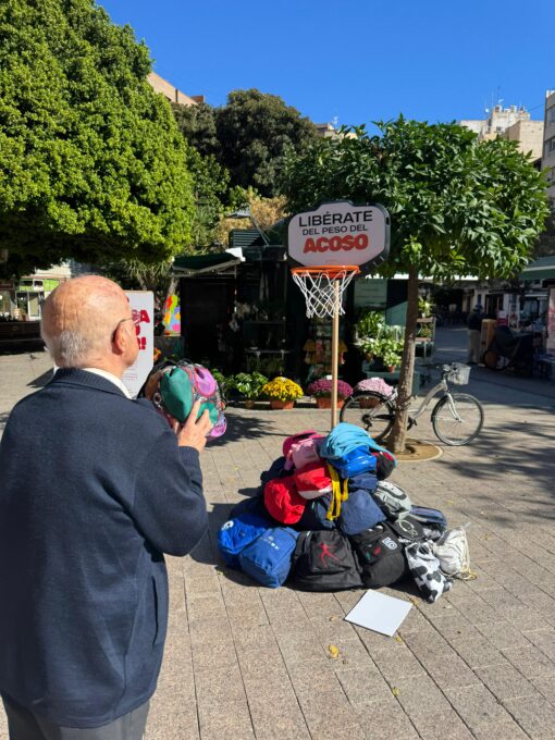 Nuestros activistas preparando los elementos de la performanceLa performance ya instalada en la Plaza de Santo DomingoNuestros activistas preparados para la acción a pie de calle¡Los primeros en atreverse a encestar!Nuestra presidenta junto con los activistasDespués de lanzar la mochila se invitó a dejar unas palabras y testimonios sobre el ascosoMaribel Marín y Miguel Ángel de Paco hicieron una entrevista para Cadena Ser sobre la importancia de visibilizar el acoso escolarDesde los más mayores a los pequeños pudieron liberarse del peso¡Cualquiera podía acercarse a tirar!Se informó a quienes pasaban por la plaza de Santo Domingo sobre lo importante que es tomar conciencia de este tipo de problemas en la escuela