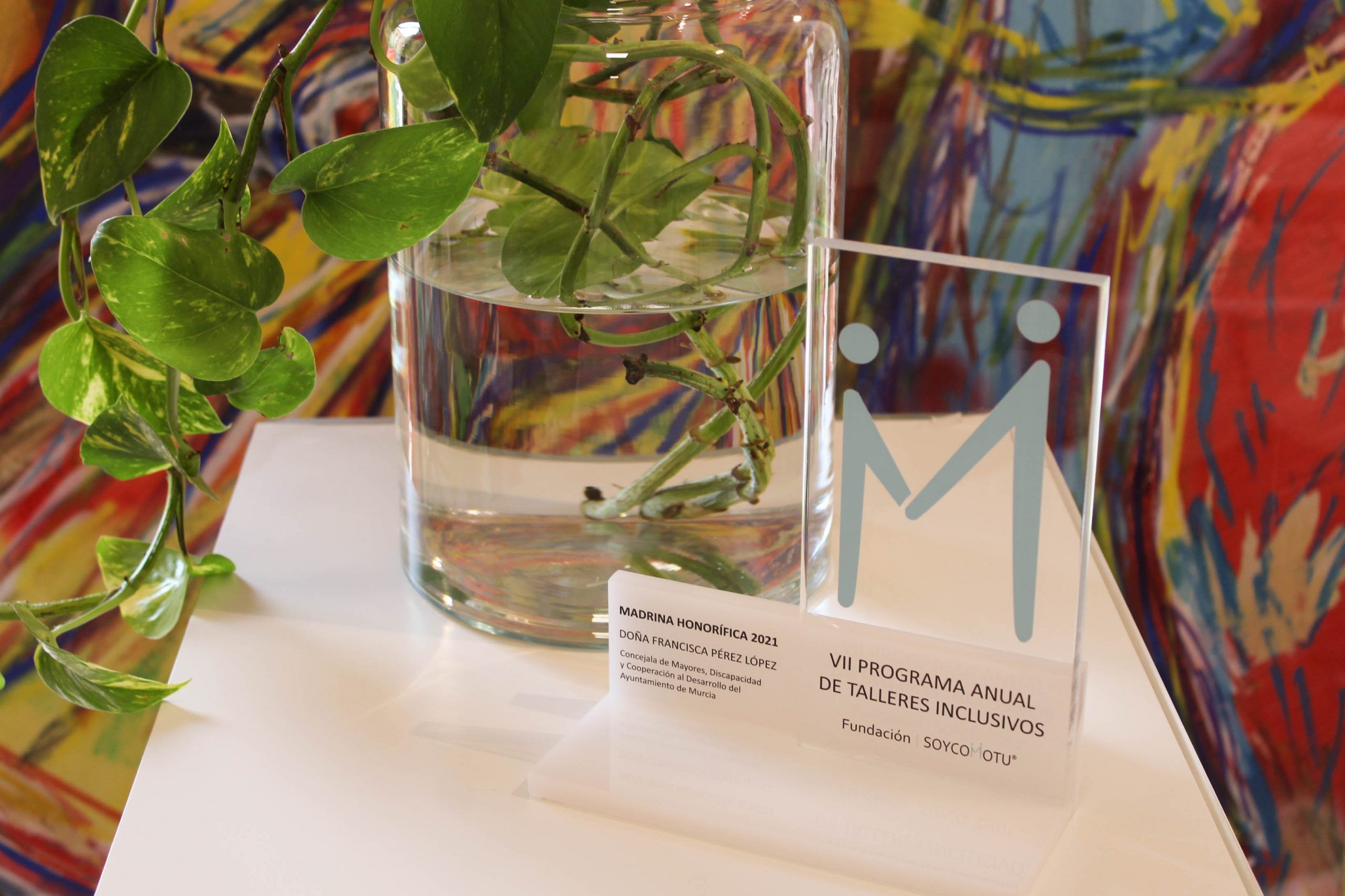 Dña. Paqui Pérez López, Concejala Delegada de la concejalía de Mayores, Vivienda y Servicios Sociales del Ayuntamiento de Murcia recibe la condecoración de Madrina Honorífica del Programa Anual de Talleres Inclusivos SoyComotú 2021.