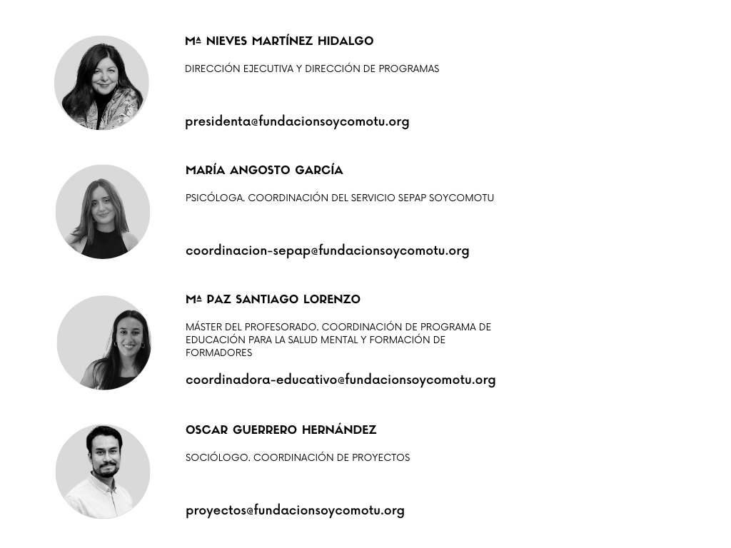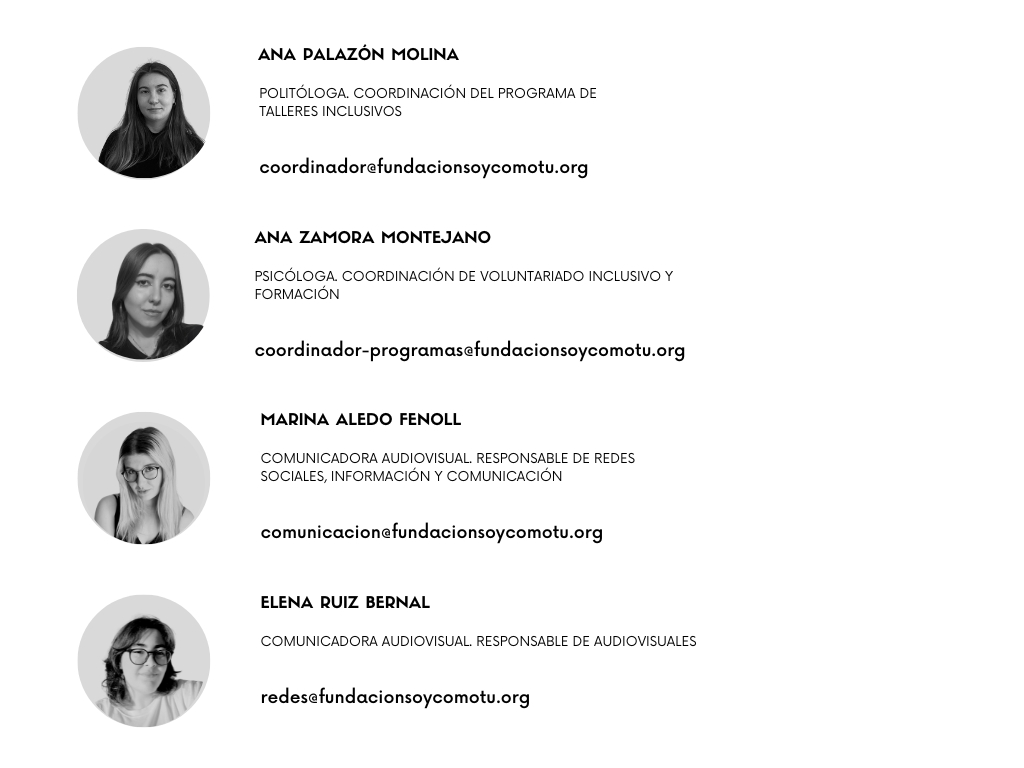El equipo de Fundación SOYCOMOTU está formado por 7 trabajadores y 83 voluntarios/as, más la directora ejecutiva y de programas (voluntaria).
