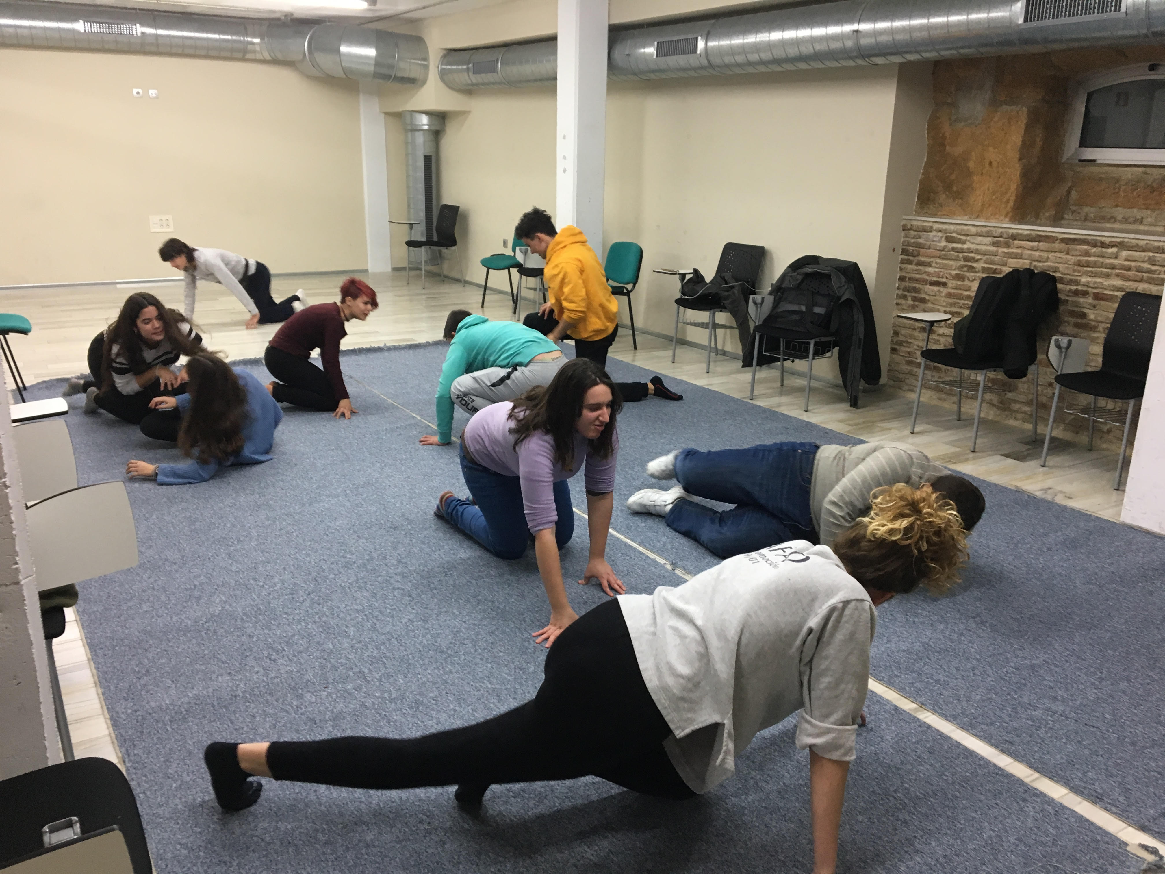 Andrea: Yo creo que esos ejercicios son tipo expresión corporal, por ejemplo el monitor del taller dice, venga, ahora sois bebes, y nada nos tiramos al suelo, nos imaginamos que somos bebes y claro, cada uno está en lo suyo, en su tema y está bastante bien, es interesante.