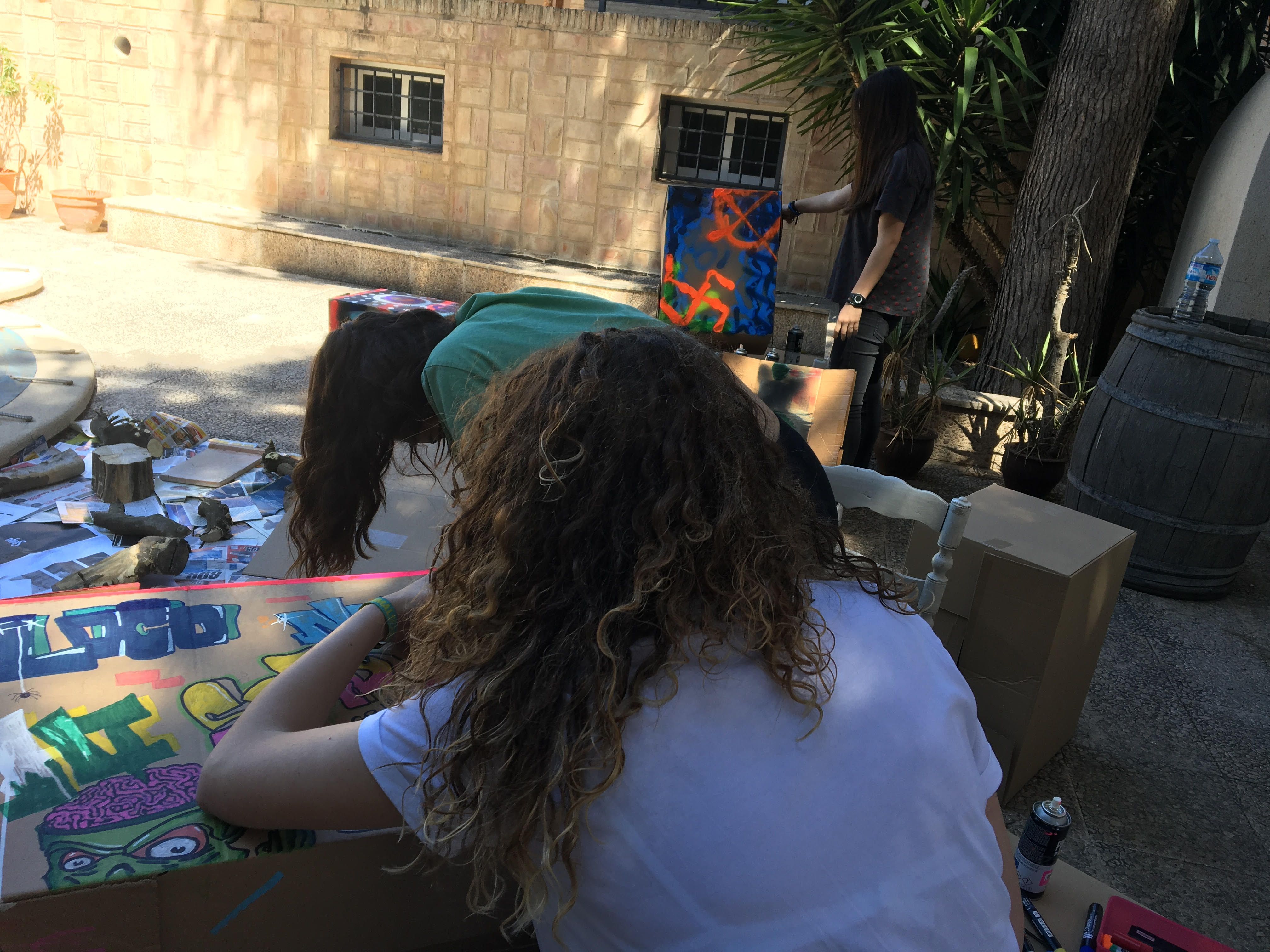 En esta fotografía fue uno de esos días, pues que, el taller no solo se centra en los viernes; es decir, se centra en los viernes porque es el día en el que quedamos todos para ensayar o para hacer ejercicios, pero, luego, por ejemplo, tres meses antes de la obra tenemos que quedar bastantes domingos para terminar el decorado, porque lo hacemos nosotros, y para seguir ensayando. Este me parece que fue un domingo que quedamos algunos para terminar el decorado; se basaba en pintar con grafiti una serie de cajas de cartón pues la obra se llevaba a cabo en un callejón. Primero teníamos que hacerlo a lápiz y luego con grafiti, y hemos descubierto como hay compañeros de teatro que tienen dotes para el grafiti.