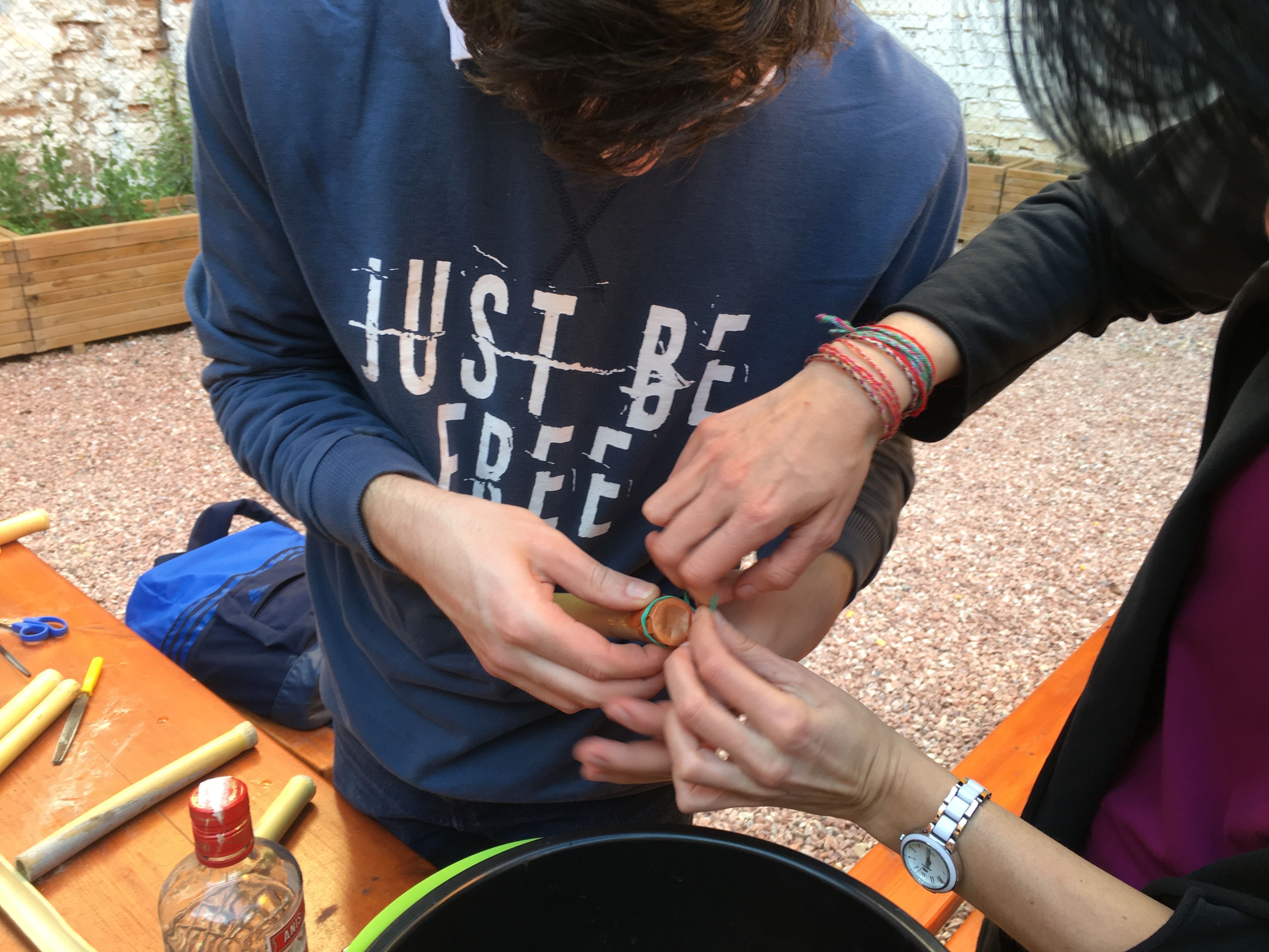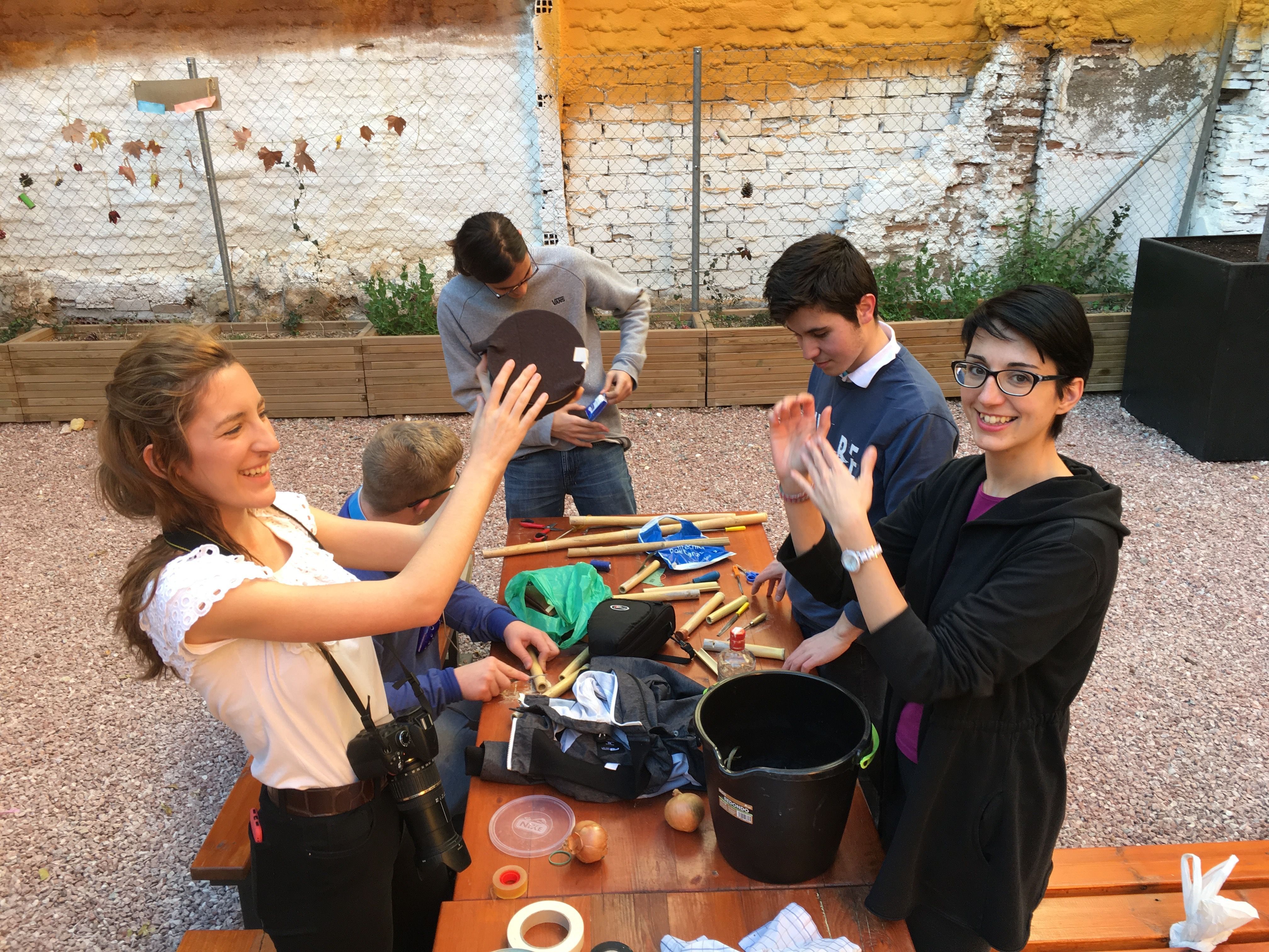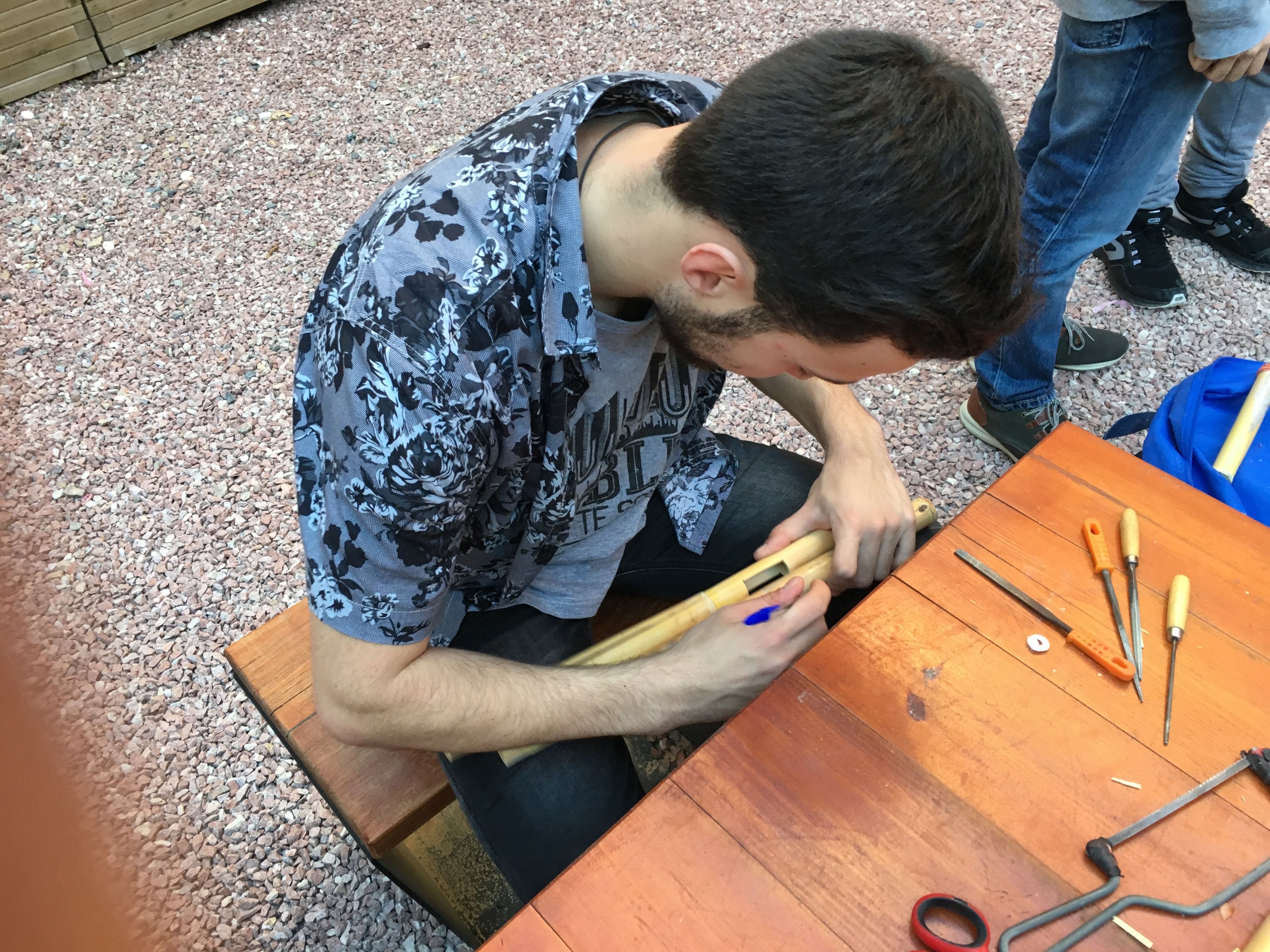 Allí fabricaron instrumentos típicos de la Huerta valiéndose de materiales poco convencionales, algo a lo que ya están sobradamente acostumbrados. Por ejemplo, fabricaron panderetas con latas gigantes de atún. También fabricaron pitos de caña de carnaval con cañas y cebollas. Y por supuesto, tuvieron la oportunidad de descubrir las famosas carrascletas y el rascador con la botella de anís del mono. Una vez fabricados los instrumentos, los participantes pudieron interpretar música típica de la Huerta, entre ellas, una nana huertana.