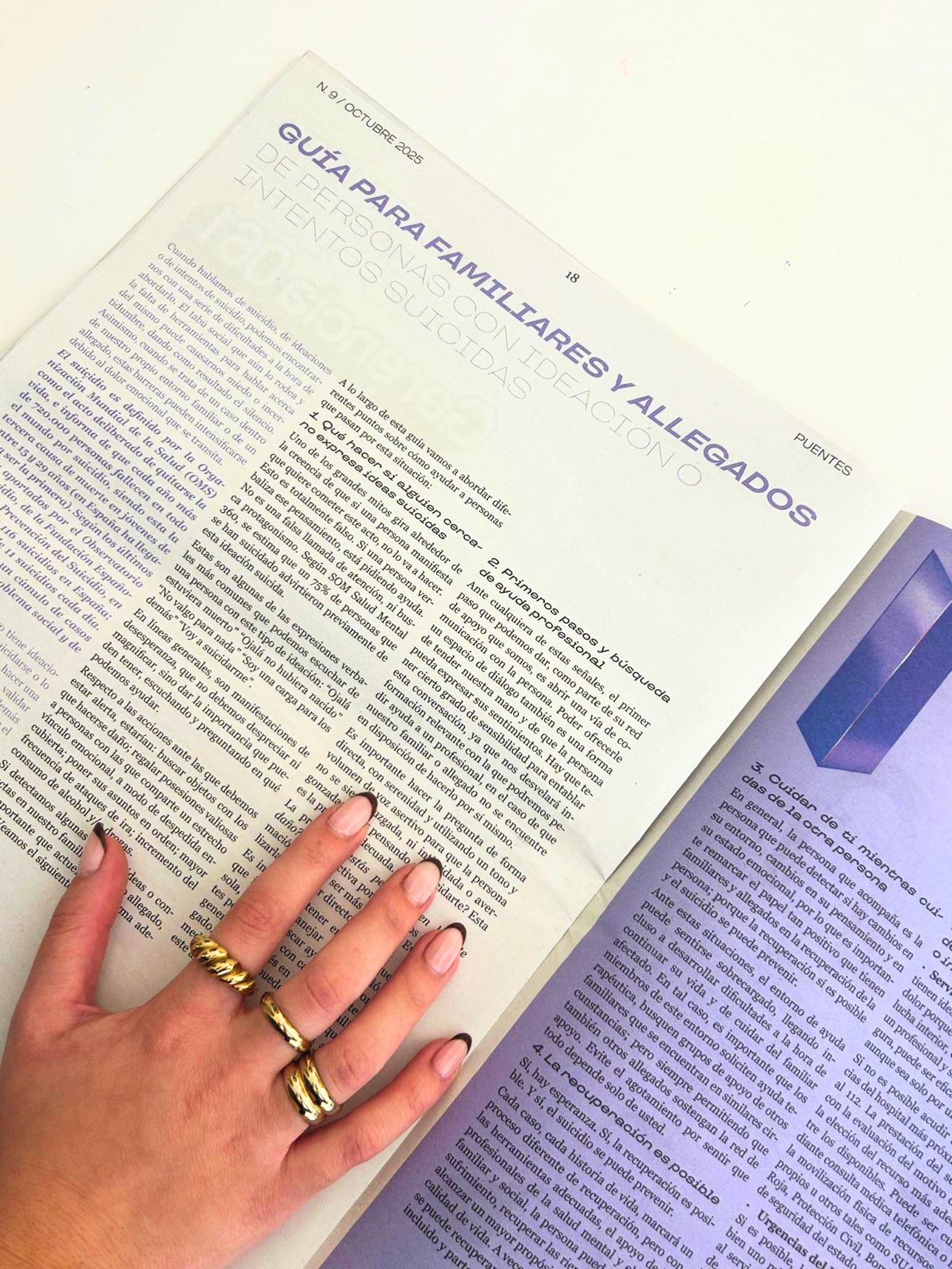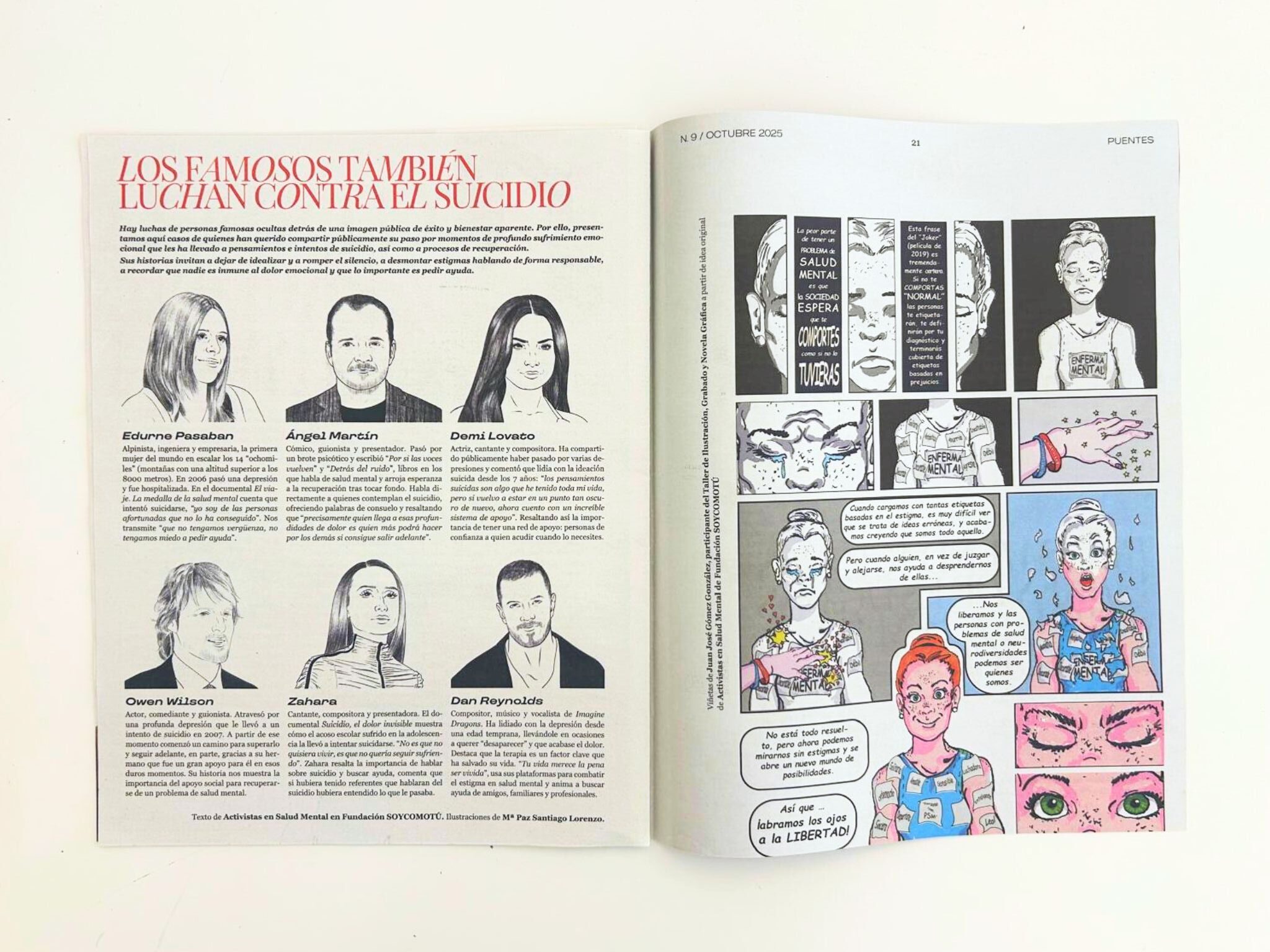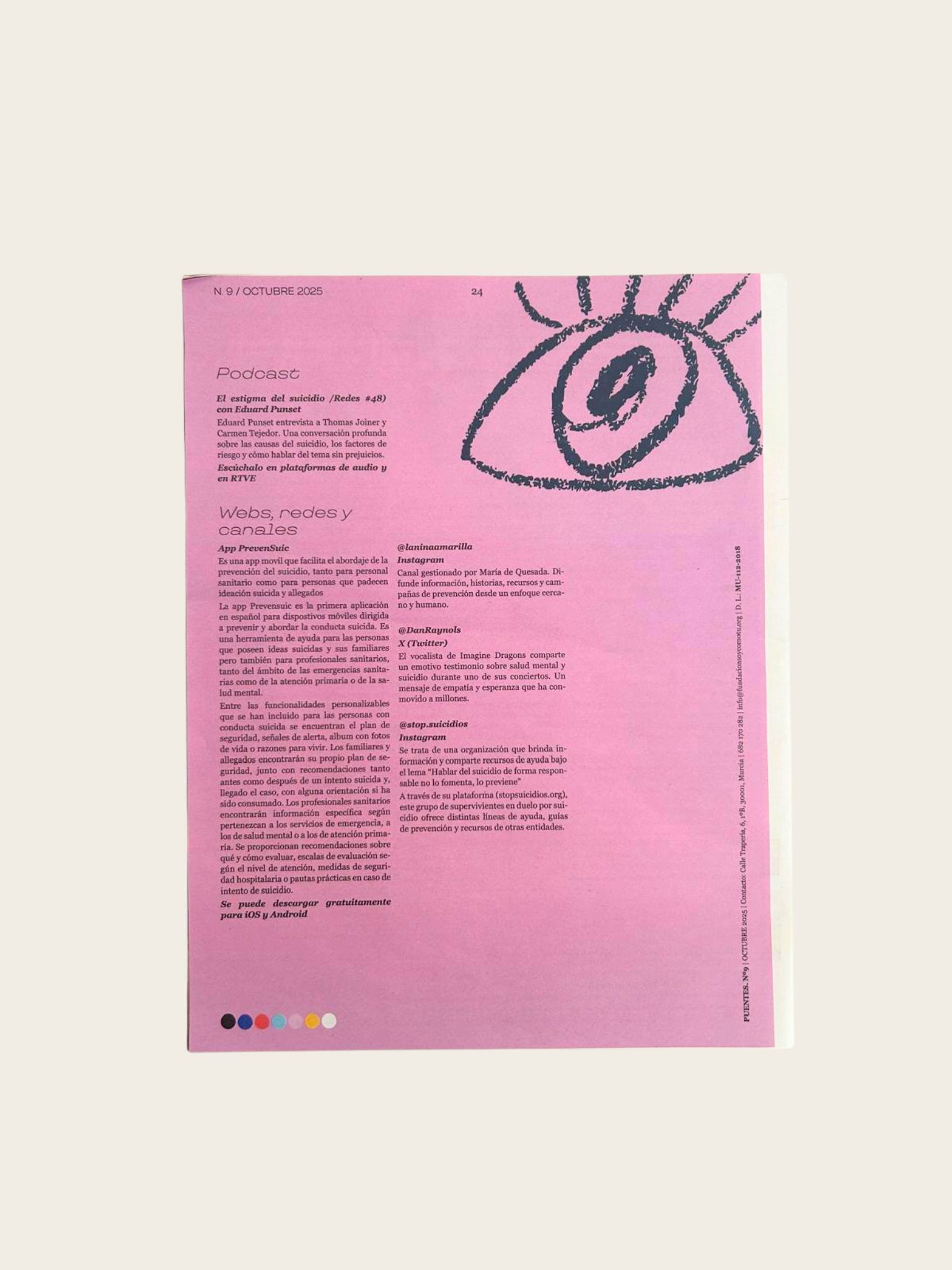 Este último número aborda la Prevención del Suicidio, una situación en la que se ve relacionada la salud mental. Recoge, entre otros artículos, una entrevista a la Dra. Loreto Medina, experta en estrategias de prevención del suicidio; una guía de ayuda para familiares de personas con conductas suicidas, así como testimonios en primera persona, entre otros muchos artículos.